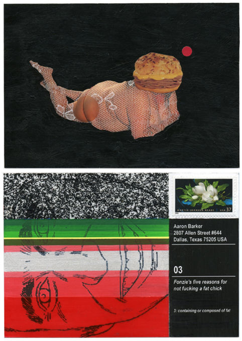 Tabloid, acrylic, sticker, plastic and paper on postcard