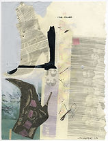 Newsprint transfer, price tags, feathers, sequins, polyurethane, and acrylic on paper