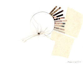 Tabloid, tissue paper, hair, string, acrylic, and pencil on 110lb paper