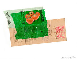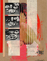 Tabloid, antique paper, food wrapper, photocopy, tissue paper, silkscreen, acrylic, and pencil on 110lb paper