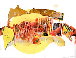 Tabloid, tissue paper, photocopy, silkscreen, photographic print, food label, paper, acrylic, and pencil on 110lb paper