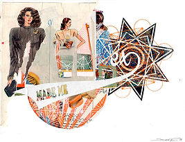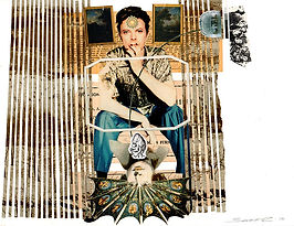 Tabloid, stickers, silkscreen, tissue paper, antique paper, acrylic, and pencil on 110lb paper