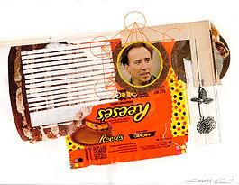 Tabloid, silkscreen, food packaging, acrylic, and pencil on 110lb paper