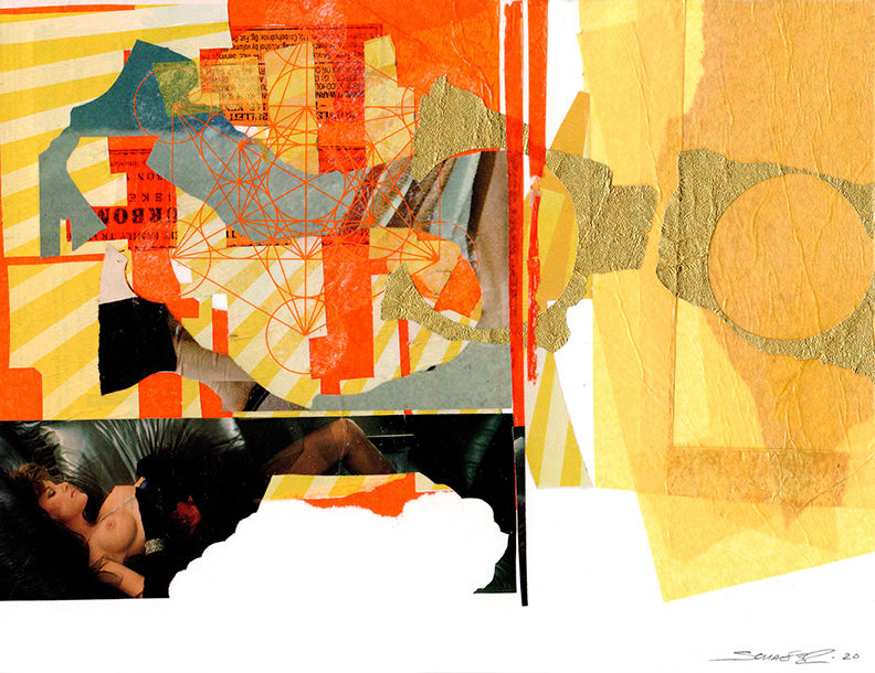 Tabloid, paper, food packaging, tissue paper, silkscreen, gold foil, acrylic, and pencil on 110lb paper