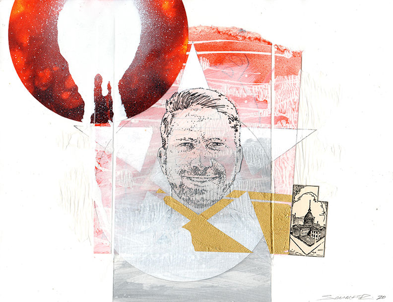 Tabloid, spray paint, paper, tissue paper, ink, champagne foil, acrylic, and pencil on 110lb paper