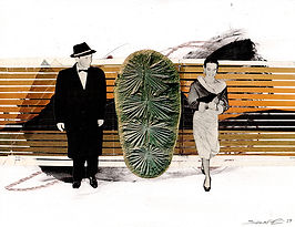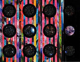 Print, spray paint, ink, tissue paper, acrylic, and pencil on 110lb paper
